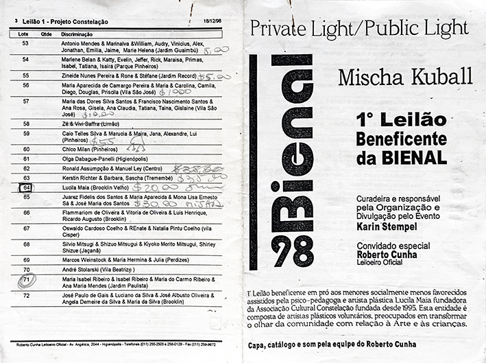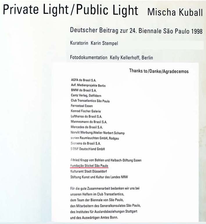 Em 1998, seis anos antes do início do meu trabalho de “ressurreição” da Fundação Stickel em 2004, alguém me procurou para pedir ajuda, tratava-se da finalização do catálogo da exposição “Private Light/Public Light” do artista Mischa Kuball, representante alemão na 24ª Bienal de São Paulo.