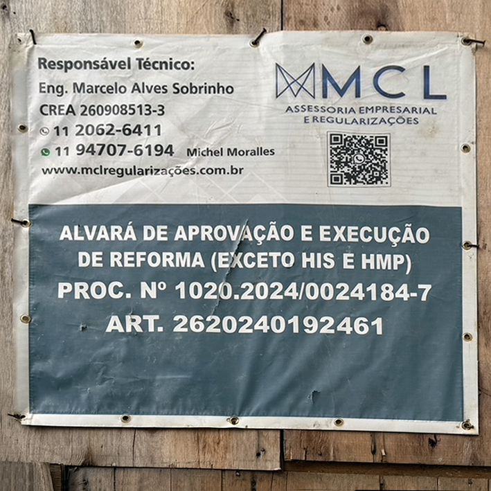 Fui verificar o site constante da placa, mclregularizacoes.com.br que revelou-se inexistente… curioso… Pesquisei também o número do CREA do engenheiro Marcelo Alves Sobrinho, também inexistente… mais curioso ainda… O número do ART confere no site do CREA, para reforma sem acréscimo de área, mas o registro do CREA do engenheiro é outro… curiosíssimo!!!