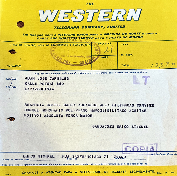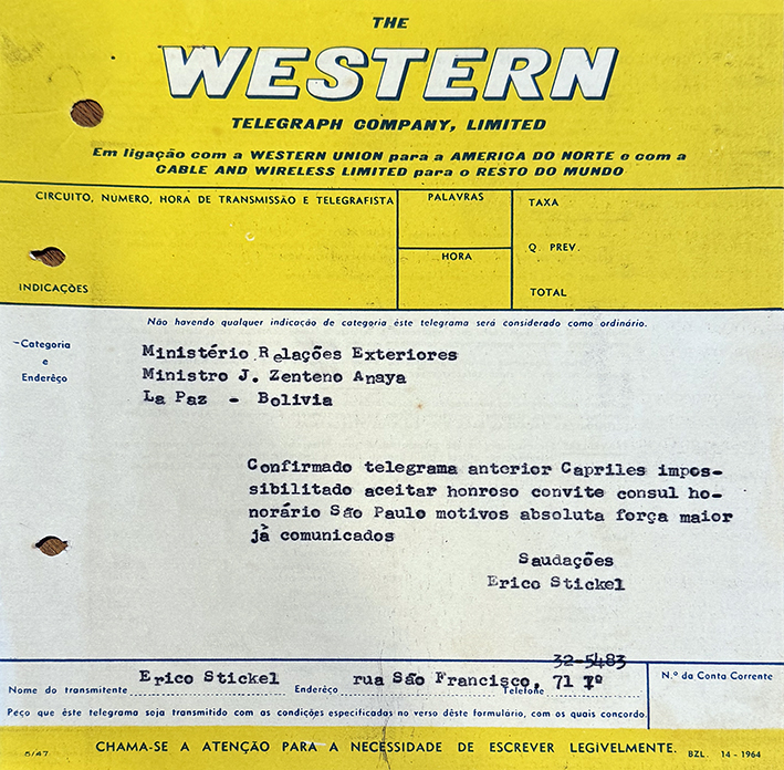 Recentemente o Manuco me enviou um documento muito interessante, a nomeação do meu pai, Erico João Siriuba Stickel como Consul Honorário da Bolivia em São Paulo, datada de 20 Janeiro 1965 e assinada pelo Gal.René Barrientos Ortuño, chefe da junta militar que estava no poder na época. Manuco me confirmou que a nomeação de meu pai se realizou através de indicação de Ethel Mary, sua mãe.